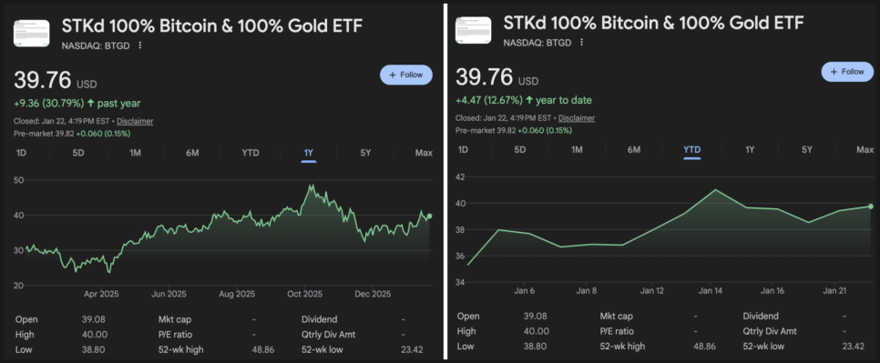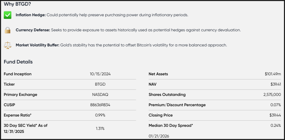 컨셉 자체는 요즘 시장 흐름과 잘 맞아 있습니다. 한쪽에서는 비트코인을 장기 성장 자산으로, 다른 한쪽에서는 금을 인플레이션이나 통화 가치 하락에 대비하는 자산으로 보고, 변동성이 큰 자산과 상대적으로 안정적인 자산을 함께 가져가겠다는 발상입니다. 특히 최근처럼 비트코인이 위험자산처럼 움직이고, 금이 다시 안전자산 역할을 하는 국면에서는 이런 구조가 왜 나왔는지 이해가 되죠.