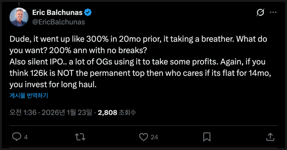 발추나스는 “그 전 20개월 동안 300% 가까이 올랐다”며, 매년 200%씩 쉬지 않고 오르길 기대하는 건 비현실적이라고 말했습니다. 지금의 가격 움직임은 급등 이후 나타나는 조정과 횡보 국면에 가깝다는 해석입니다.