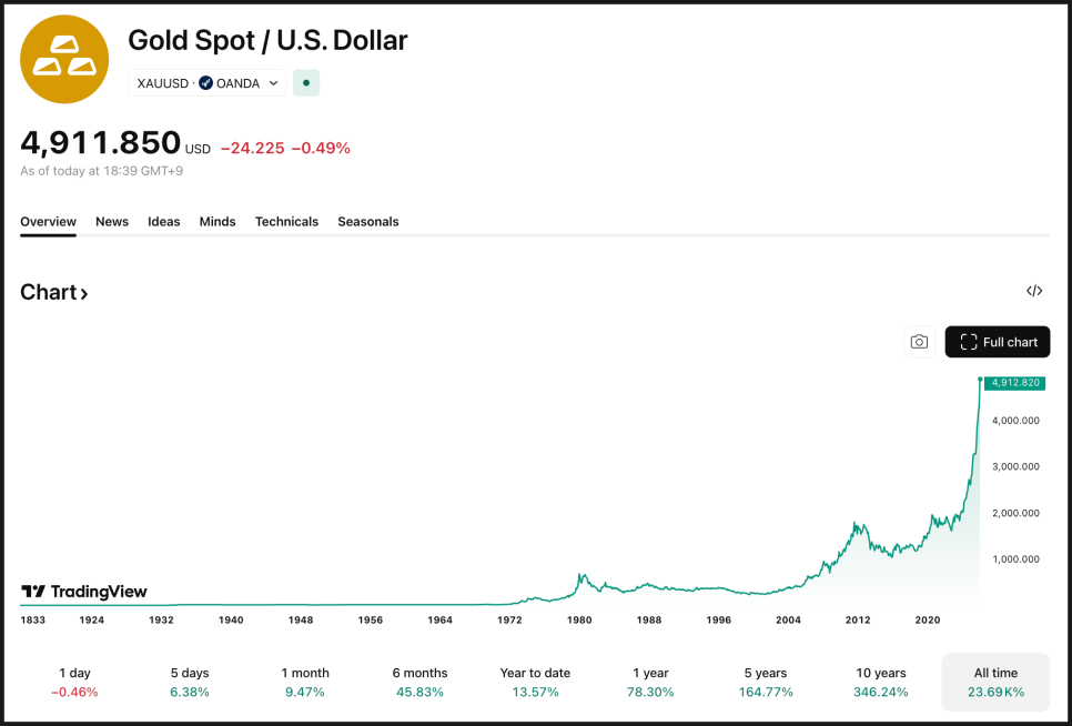 얘기 나온 김에 금 얘기를 해보겠습니다. 금 가격이 온스당 5,000달러에 바짝 다가서면서 시장의 시선이 다시 한 번 전통 자산으로 쏠리고 있습니다. 목요일 금은 사상 최고치인 4,930달러를 기록했고,