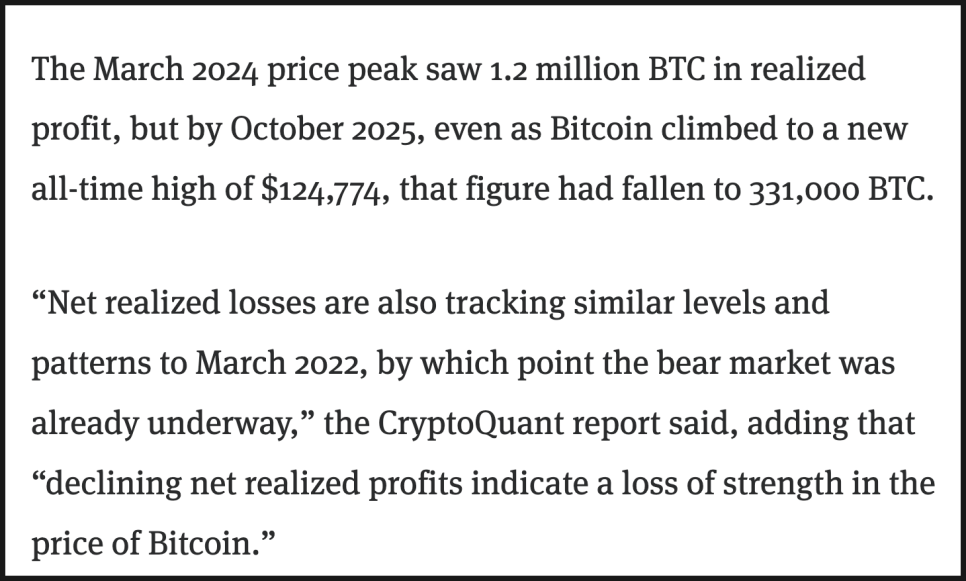 과거 데이터와 비교하면 대비가 더 뚜렷해집니다. 2024년 3월 고점 당시에는 약 120만 BTC 규모의 이익이 실현됐지만, 2025년 10월 비트코인이 사상 최고가를 새로 찍었을 때는 실현 이익이 33만 BTC 수준으로 크게 줄어 있었습니다. 가격은 더 올랐는데, 실제로 확정된 이익은 오히려 줄어든 셈이죠. CryptoQuant는 이런 패턴이 2022년 약세장 직전과 유사하다고 지적합니다.