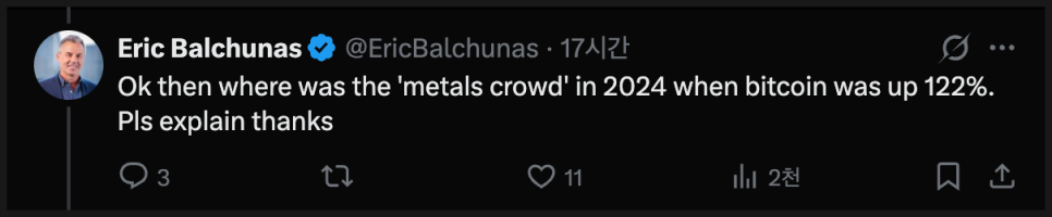 하지만 마지막으로 발추나스는 다시 한 번 시야를 넓히자고 말합니다. 2024년 11월 기준으로 보면 비트코인은 전년 대비 122% 상승하며 금을 확실히 앞서고 있었고, 최근의 귀금속 강세는 그동안 뒤처졌던 부분을 따라잡는 과정일 수 있다는 겁니다.
