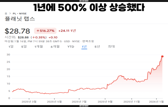 25년 말 미국 우주항공주와 위성주는 정말 최고의 한 해를 맞이했다. 미국 우주 위성 관련주는 위성제조, 발사체, 위성데이터와 통신, 방산으로 나눌 수 있다. 위성통신으로는 ASTS가 유명하고 발사체로는 로켓랩, 방산주로는 록히트 마틴, 위성 제조로는 플래닛 랩스와 블랙스카이가 있다. 그 중 미국 우주 위성주인 플래닛 랩스는 무려 585%나 상승한 기염을 보였다. 21년 상장하고 그 당시에 10달러 대에서 놀다가 24년부터 상승기류를 보이더니 25년 폭발적인 성장을 보여 지켜만 보던 사람에게 포모를 오게 했다.