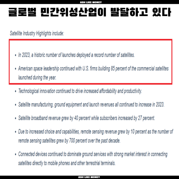 위성을 생산하는 제조비용도 감소하고 수요증가로 2025년~31년 동안 위성 산업은 두자리 수의 성장률이 기대된다고 한다. 최근 미국 내 스페이스X와 같은 민간 사업체가 성장하면서 초저비용 발사, 대규모 위성의 구축으로 상업적으로 이용하는 위성 관련 회사도 증가하고 있다. 미국은 위성 산업에 미사일 방어, 정찰 및 정보 활용, 위협 탐지 등의 자본금을 퍼붇고 있어 국가 안보를 더욱 단단하게 만들고 있다. 여기에 위성 유지보수 및 수리 시장도 성장할 것으로 보인다.