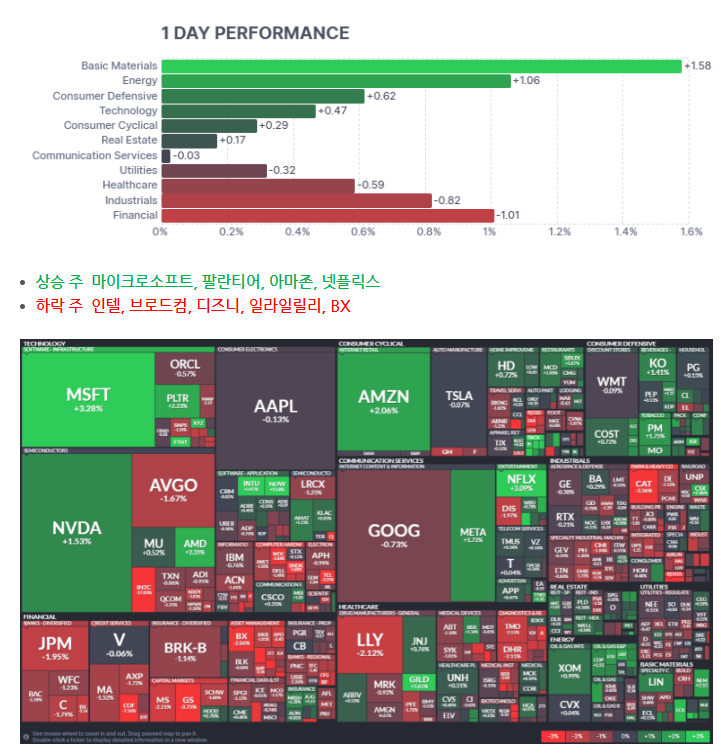 빅테크 강세: 지수 하락 시 저가 매수세 유입으로 마이크로소프트(+3.28%), 아마존(+2.06%), 엔비디아(+1.53%) 상승.