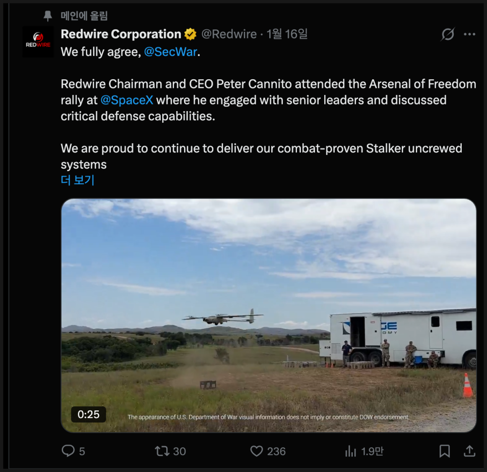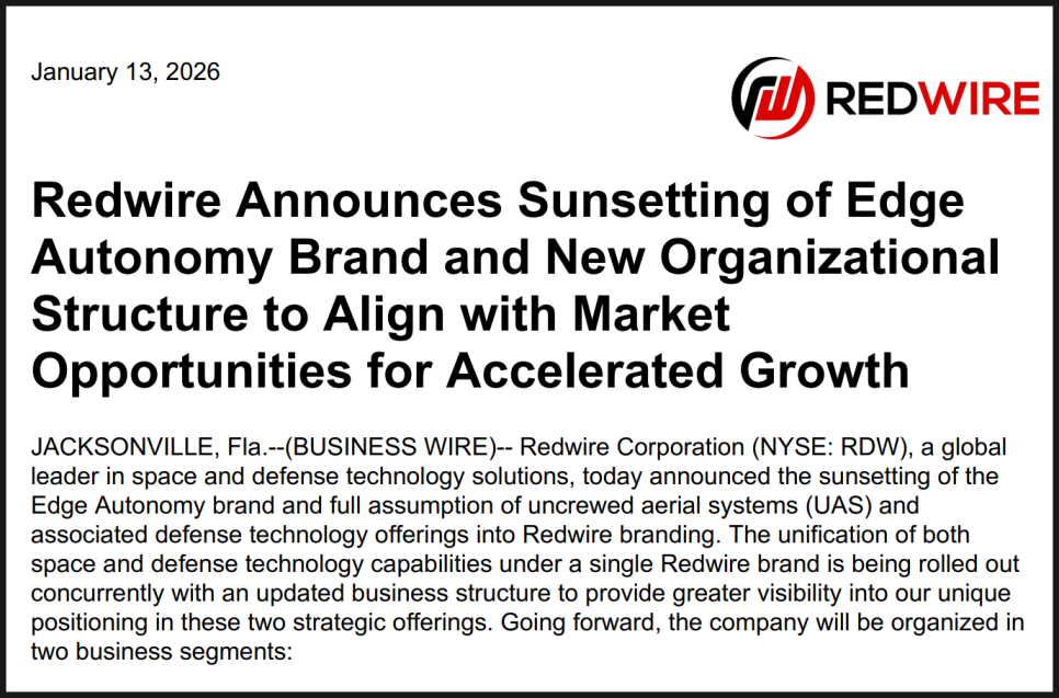 한편 최근 기업 차원의 변화도 있었습니다. 레드와이어는 무인 항공 시스템과 방산 기술을 담당하던 엣지 오토노미(Edge Autonomy) 브랜드를 종료하고, 모든 관련 사업을 레드와이어 단일 브랜드로 통합한다고 발표했습니다. 동시에 사업 구조를 ‘우주(Space)’와 ‘방산 기술(Defense Tech)’ 두 부문으로 재편하며 운영 효율성을 높이겠다는 전략을 내놓았습니다.