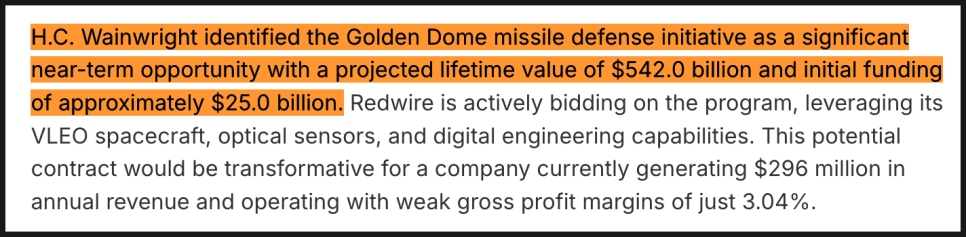 이러한 맥락에서 ‘골든 돔(Golden Dome)’ 미사일 방어 구상은 레드와이어에게 가장 중요한 단기 기회로 언급됐습니다. 에이치씨 웨인라이트는 이 프로젝트의 전체 생애 가치가 약 5,420억 달러에 이를 수 있고, 초기 예산만 해도 약 250억 달러 규모로 추정했습니다. 레드와이어는 현재 이 프로그램에 적극적으로 입찰 중이며, 초저지구궤도 위성, 즉 매우 낮은 고도에서 운용되는 위성 플랫폼(VLEO spacecraft), 우주 기반 광학 센서, 그리고 디지털 엔지니어링 역량을 핵심 강점으로 내세우고 있습니다. 현재 연간 매출이 약 2억 9,600만 달러 수준이고, 매출 총이익률이 3%대에 불과한 회사라는 점을 감안하면, 골든 돔 관련 수주는 사업 구조 자체를 바꿀 수 있는 잠재력을 가진 기회로 평가됩니다.