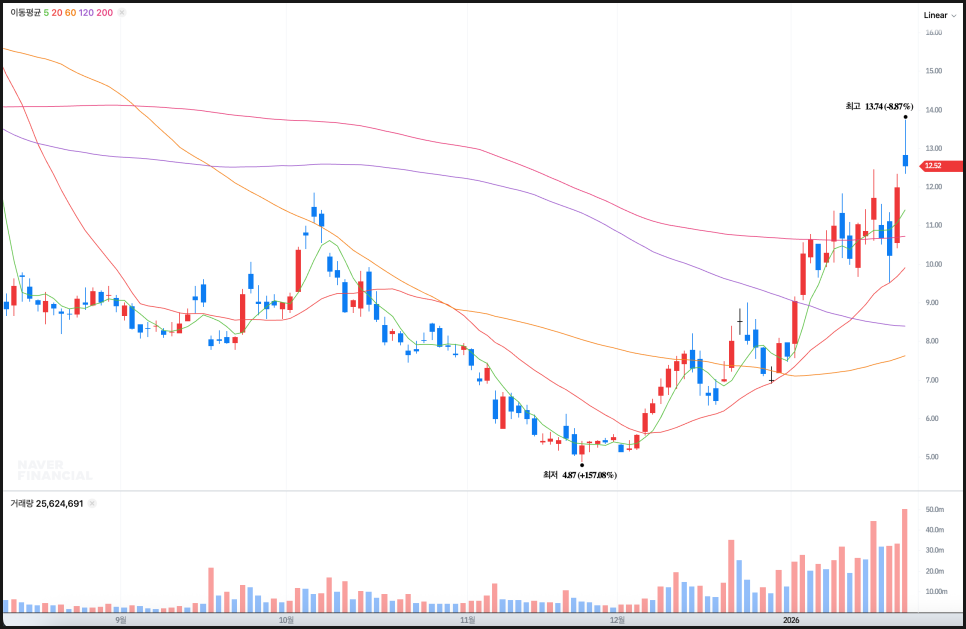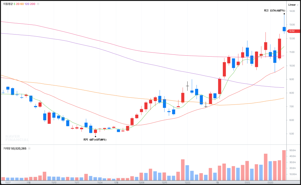 특히 요즘 들어 거래량이 엄청나게 늘었는데, 하루 동안 3000만에서 4000만 주 이상이 거래되며 평소보다 훨씬 많은 거래량이 동반됐다는 점에서, 테마성 자금 유입이 강하게 작용한 것으로 보입니다.