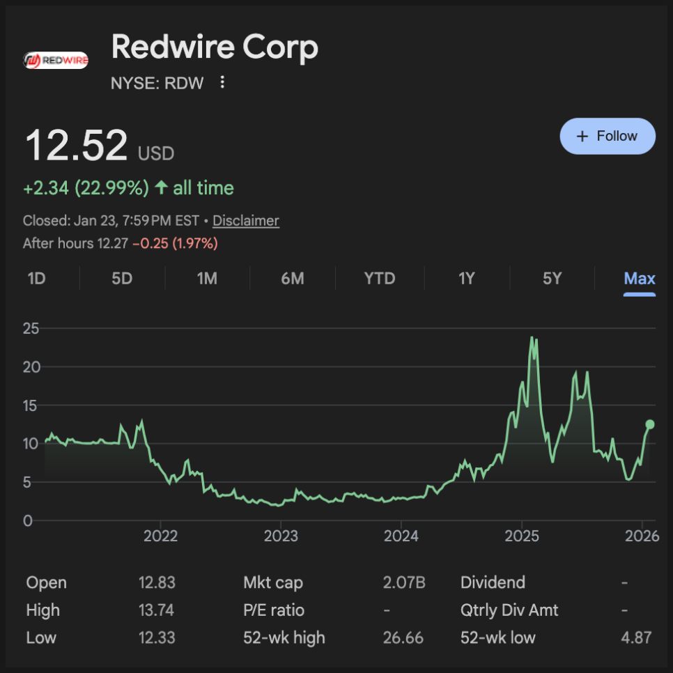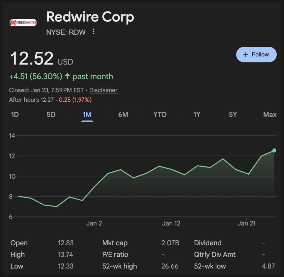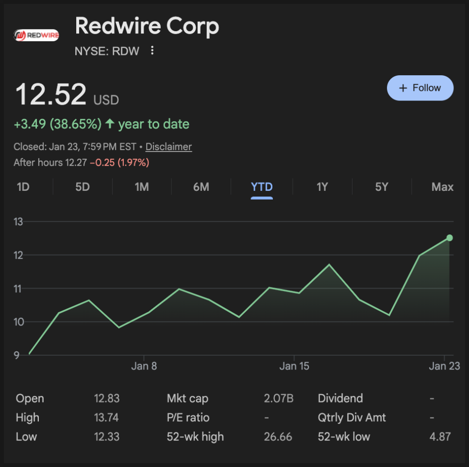1월 23일 기준으로 레드와이어(Redwire Corporation) 주가는 12.5 달러에 거래되고 있는데, 며칠 연속 급등하며 시장의 강한 주목을 받았습니다. 올해 벌써 40% 가까이 올랐네요.