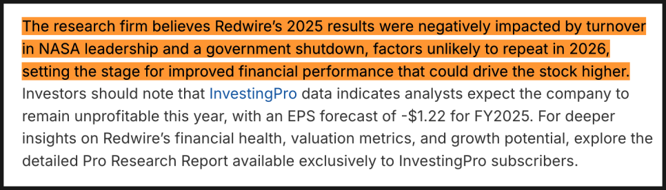 다만 에이치씨 웨인라이트는 2025년 실적이 다소 부진했던 배경에 대해서도 언급했습니다. 나사(NASA) 리더십 교체와 미국 정부 셧다운이 겹치며 프로젝트 진행과 수주에 영향을 미쳤다는 분석인데요. 이러한 요인들은 2026년에 반복될 가능성이 낮다고 판단하며, 이로 인해 실적 환경이 개선될 여지가 있다고 보고 있습니다. 그럼에도 불구하고 다수의 애널리스트들은 레드와이어가 올해에도 흑자 전환에는 실패할 것으로 예상하고 있으며, 2025 회계연도 주당순이익(EPS) 전망치는 -1.22달러로 제시되고 있습니다. 물론 이런 예상을 깨부수고 흑자 전환에 성공한다면 주가는 우주로 날라가겠죠.