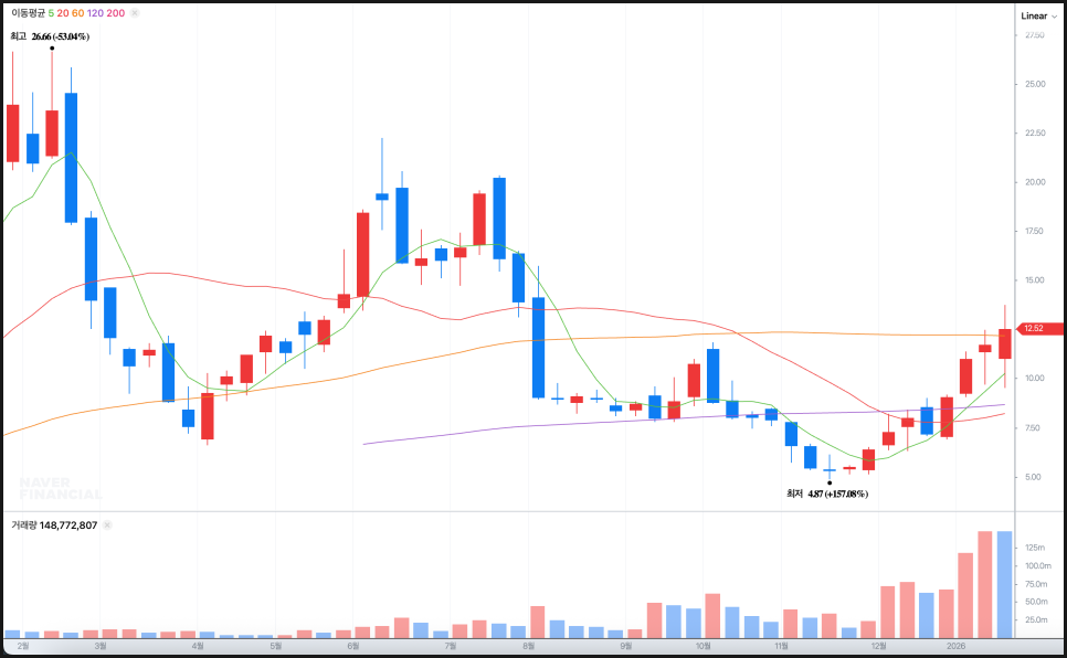 먼저 주봉 차트부터 보면, 레드와이어는 작년 고점이었던 26달러대 이후 장기간 하락 추세를 겪으면서 한때 4.8달러 부근까지 밀렸습니다. 이 구간은 거의 1년 가까이 이어진 중장기 하락의 종착점에 해당하는 자리였고, 이후 바닥을 다지는 과정이 꽤 길게 이어졌습니다. 60주선과 120주선 아래에서 오랫동안 횡보하면서 거래량도 크게 줄어들었는데, 강한 손절이 이미 끝났고 남아 있는 투자자들이 많지 않았었다는 신호로 해석할 수 있습니다.