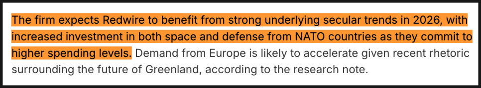 에이치씨 웨인라이트가 특히 주목한 부분은 2026년을 향한 구조적인 추세입니다. 북대서양조약기구(NATO) 국가들을 중심으로 우주와 방위 분야에 대한 투자가 동시에 확대되고 있는데, 단기 이벤트가 아닌 중장기적인 흐름으로 보고 있다는 설명입니다. 연구 노트에서는 특히 유럽발 수요 증가 가능성을 강조했는데요. 최근 그린란드의 전략적 위치를 둘러싼 외교적 발언과 논의가 이어지면서, 유럽 국가들의 국방 및 우주 인프라 투자가 가속화될 수 있다는 관측입니다.