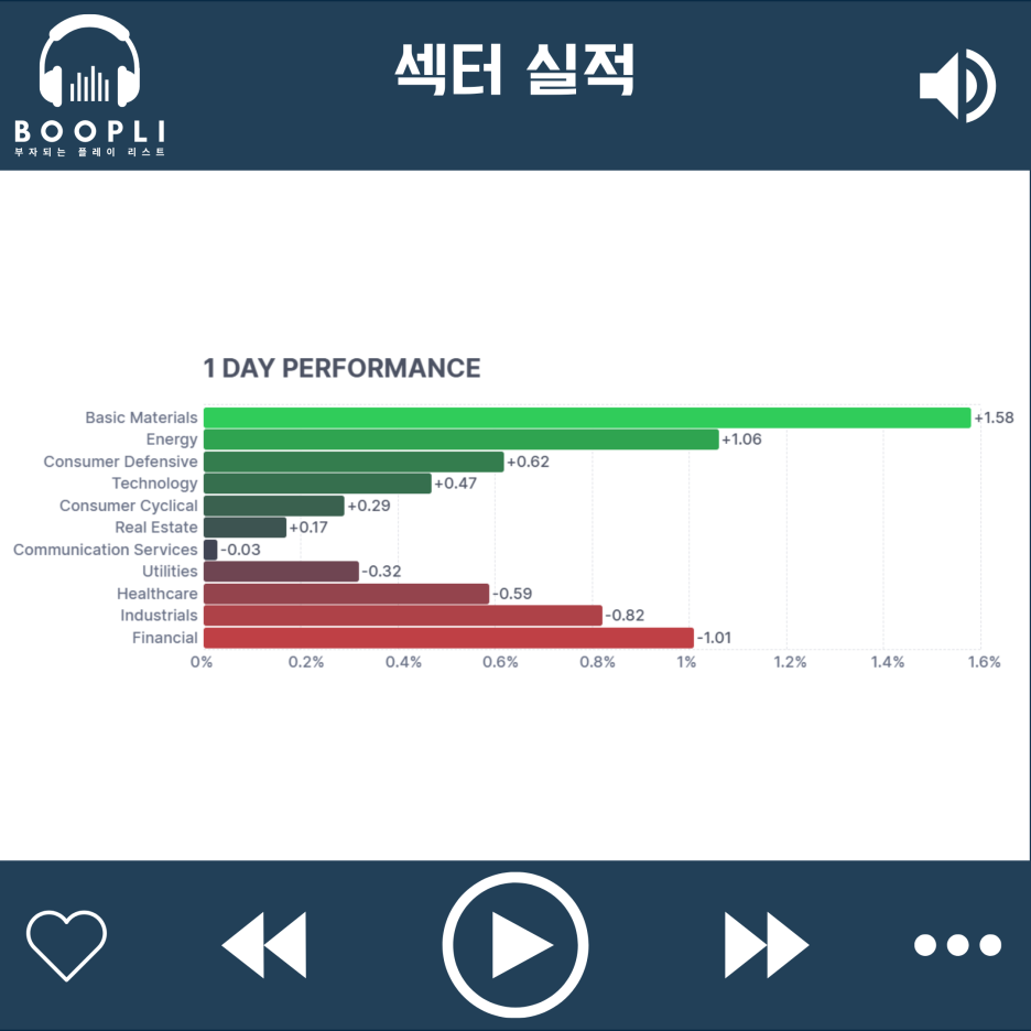 기술, 소비 순환재, 부동산 섹터는 강보합, 유틸리티, 커뮤니케이션 서비스 섹터는 약보합 마감