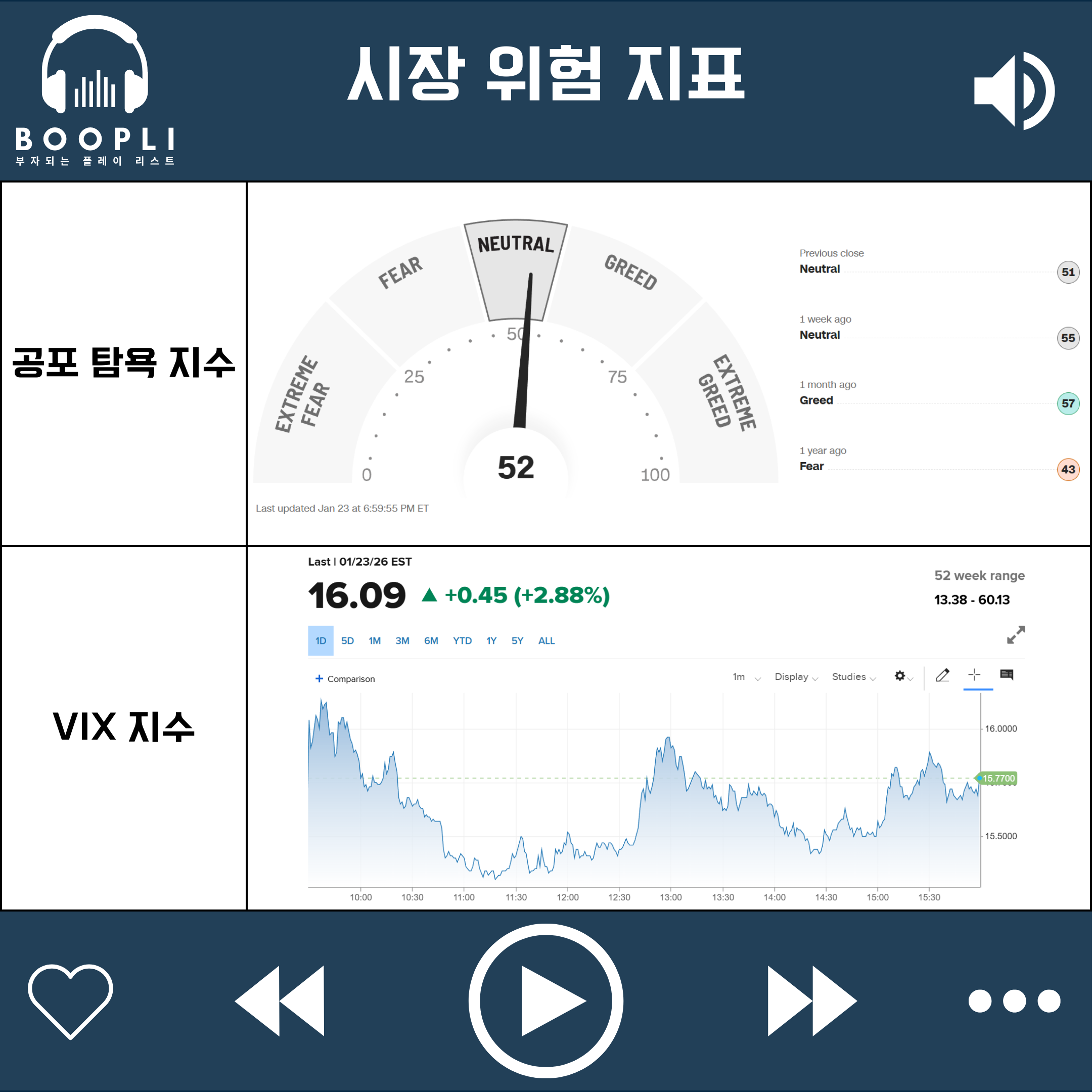개장 전에는 트럼프 대통령이 그린란드 관련 관세 위협을 철회하고, 유럽연합(EU)이 보복 관세를 6개월간 유예하면서 지정학적 긴장이 완화됨