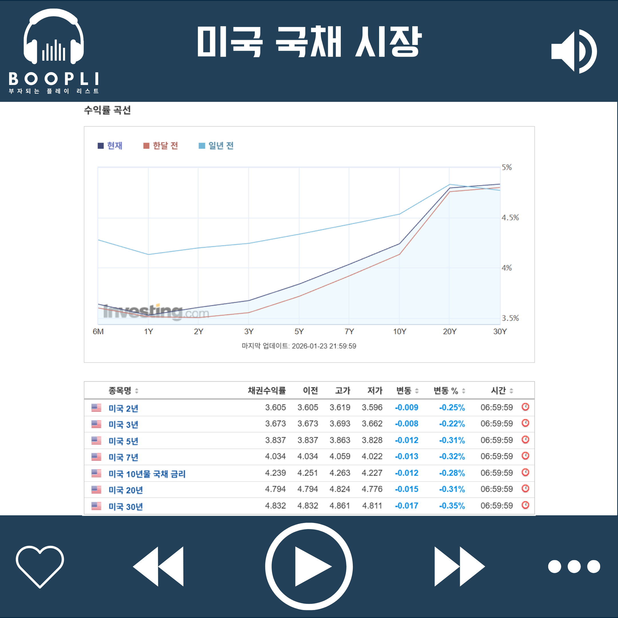 미국 국채는 1월 S&P 서비스 구매관리자지수(PMI) 부진과 양호한 1월 미시간대 소비자심리지수 등 엇갈린 경제 지표 속에서 미군 함대가 이란으로 향하고, 미국이 쿠바 해상 봉쇄를 검토한다는 소식에 안전자산 수요가 높아지며 장단기 금리 모두 소폭 하락