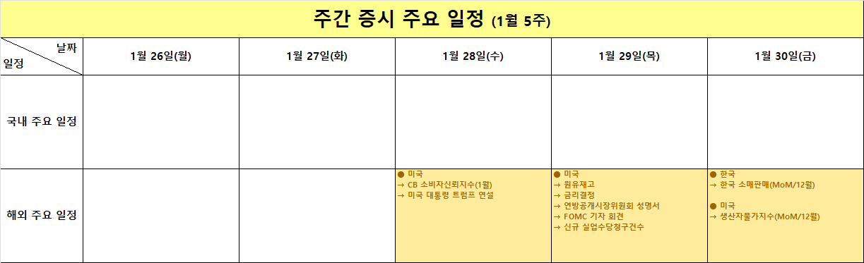 이번 주는 굵직한 이벤트가 연이어 예정되어 있어 시장의 변동성이 확대될 가능성이 높아 보입니다. 1월 28일에는 미국 CB 소비자신뢰지수 발표와 함께 트럼프 대통령의 연설이 예정되어 있습니다. 소비자신뢰지수는 미국 내 소비 흐름을 가늠할 수 있는 지표로 향후 경기 전망에 대한 힌트를 제공할 수 있는 데이터입니다. 여기에 정치적 메시지가 더해질 경우 시장이 단기적으로 민감하게 반응할 여지도 있겠습니다.