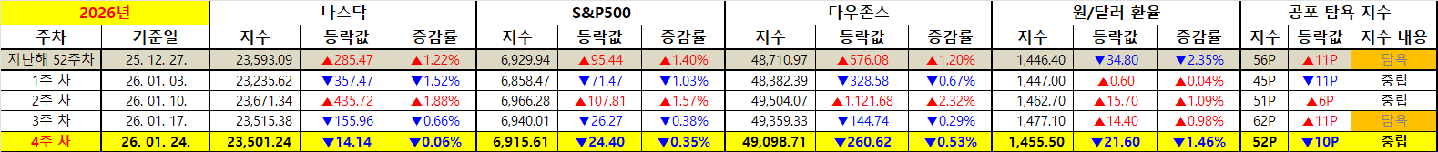 지난주 미국 증시는 전반적으로 약보합 흐름을 나타냈습니다. 나스닥 지수는 23,501.24포인트로 -0.06% 하락하며 비교적 안정적인 모습을 보였고 S&P 500 지수는 6,915.61포인트로 -0.35% 조정을 받았습니다. 다우존스 산업평균지수는 49,098.71포인트로 -0.53% 하락하며 상대적으로 낙폭이 조금 더 크게 나타났습니다. 대형 기술주 중심의 나스닥보다 경기 민감 업종 비중이 높은 다우 지수가 더 조정을 받은 점은 현재 시장이 성장 기대보다는 경기 둔화 가능성에 조금 더 민감하게 반응하고 있다는 신호로 해석할 수 있겠습니다.