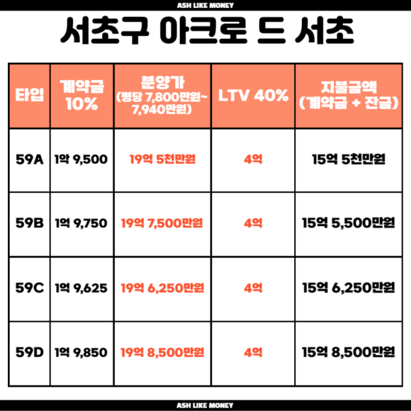 투기과열지구이기에 LTV는 40%이고 5년 이내 당첨이력이 있으면 재당첨이 제한된다. 조합원들의 계약금이 10%, 중도금 60%, 잔금 30% 수준으로 진행된 것을 보면 일반분양 역시 계약금이 10%로 맞춰질 것으로 보인다. 59타입만 일반분양될 것으로 보이기에 최소 필요 현금은 15억 5천만원이다.