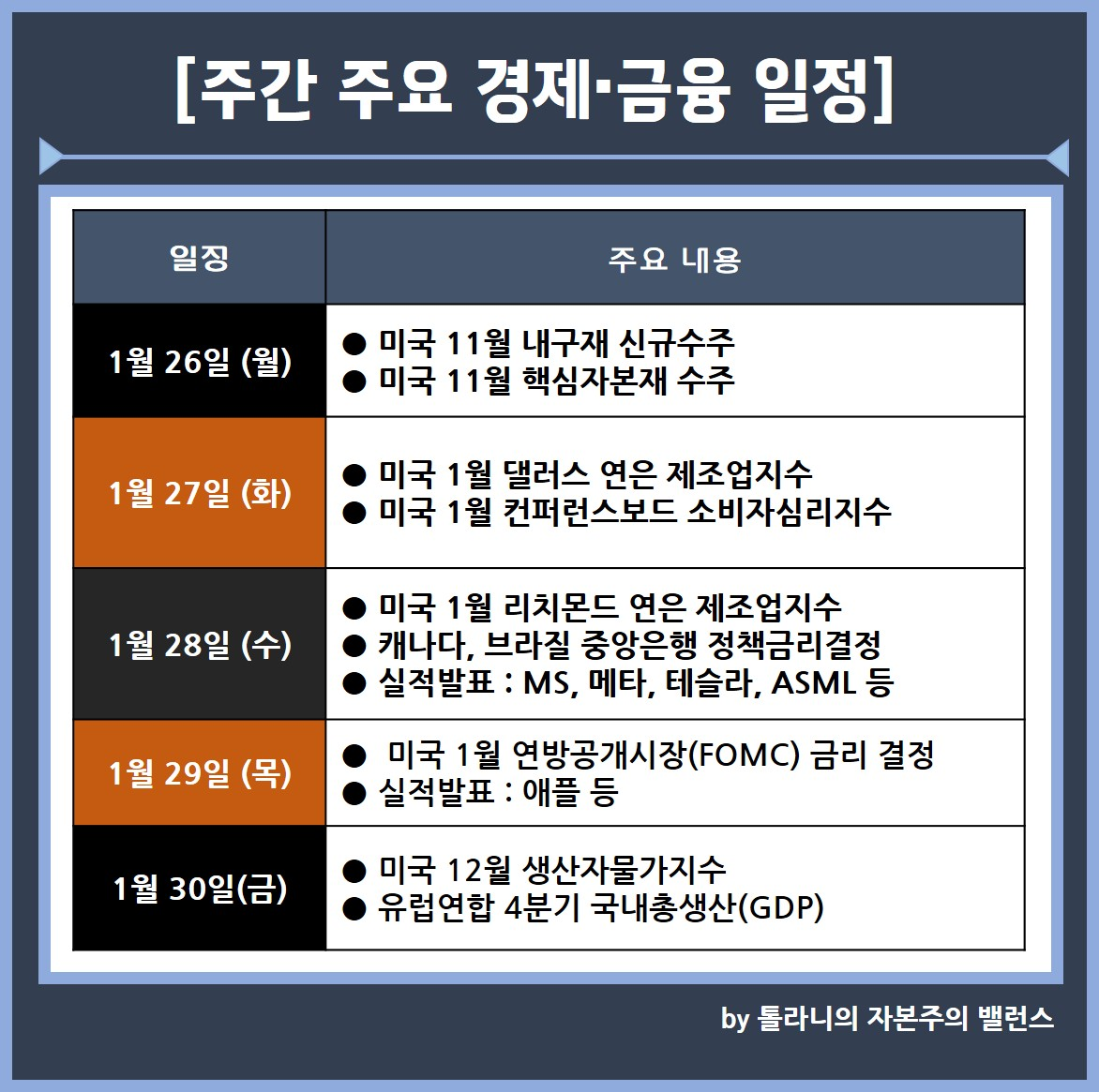 ㅇ 1.28일 Microsoft, Meta, Tesla, ASML Holdings, 29일 Apple 등 미국 주요 기업들의 4분기 실적 발표 예정. 지난주 급락후 회복하고 있는 미국 주가에 미칠 영향에 관심