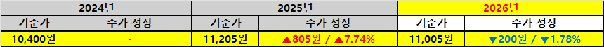 무엇보다 고무적인 부분은 배당금의 성장세인데 2024년 주당 31원이었던 배당금이 2025년에는 33원으로 6.45% 성장했고 이번 2026년에는 34원으로 전년 대비 1원 증가하며 3.03%의 성장률을 기록했다는 점은 기업들이 주주 환원에 진심이라는 사실을 방증하는 데이터이기에 장기 투자자로서 마음이 놓이는 대목입니다. 반면 주가 흐름을 살펴보면 2025년 11,205원까지 상승했던 기준가가 2026년에는 11,005원으로 전년 대비 200원 하락하며 -1.78%의 주가 성장률을 보였으나 이러한 주가 조정은 오히려 배당 재투자를 하는 우리에게는 더 싼 가격에 더 많은 지분을 확보할 수 있는 기회이기에 부정적으로만 바라볼 필요는 없습니다. 아울러 주가가 하락함에 따라 시가 배당률은 자연스럽게 상승하는 모습을 보였는데 2025년 3.53%였던 배당률이 2026년에는 3.71%로 0.17%p 증가하며 신규 진입이나 추가 매수를 고려하는 투자자들에게는 매력적인 진입 구간이 형성되었다고 해석할 수 있습니다.