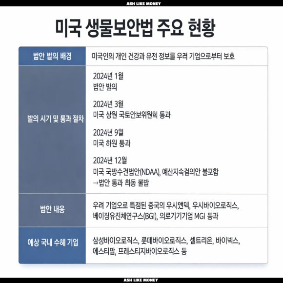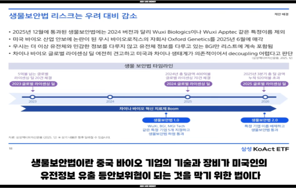 차이나 바이오 투자하면서 생길 수 있는 리스크도 있다. "생물보안법"이 대표적이다. 생물보안법이란, 중국 바이오기업인 "우시앱텍, 우시바이로직스"의 기술과 장비가 미국인의 유전정보 유출을 막기 위함이란 명분으로 연방 보조금을 받는 기업이 해당 기업과 거래하는 것을 제한하는 것이다. 다만, 리스크가 좀 완화되어 25년 12월 통과된 생물보안법에는 24버전과 달리 우시 바이로직스 같은 특정이름을 제외하였다. 미국 바이오 산업 안보에 논란이 된 우시 바이로직스의 자회사 역시 매각했다.