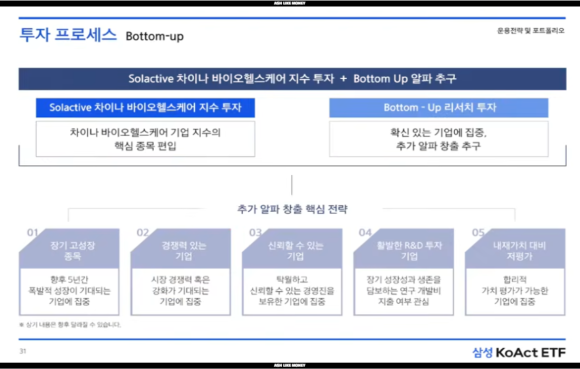 AI와 의료기기 기업 역시 투자하며 AI를 활용하여 진단을 개선하고 신약개발 효율성을 증대하며, 뷰티 쪽과 연관된 기업에도 투자하고 있다. 뷰티는 대표적인 망할 수 없는 산업분야로 예뻐지고 싶어하는 여성들과 늙기 싫은 사람들, 그루밍하는 남성들을 타겟팅하여 높은 수익률이 기대된다. 차이나 바이오헬스케어 ETF는 암, ADC, 이중항체, 면역질환, AI/의료기기, 비만과 심혈관과 관련된 분야에 집중적으로 투자한다. 총보수는 0.5%이며 연 4회 분배금 지급한다. 분배금은 1, 4, 7, 10월 마지막 영업일 및 회계기간 종료일이다.