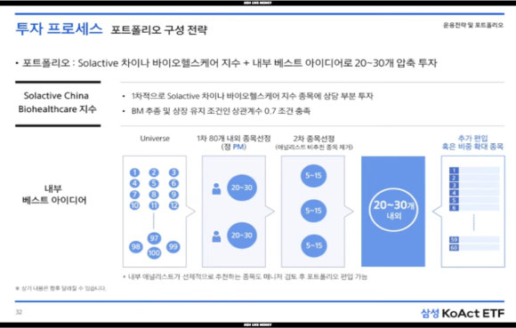 KOACT 중국 바이오헬스케어에선 총 28개 기업을 투자하며 운용한다. 차이나 핵심 회사인 우시 바이오로직스, JIANGSU, ZAI LAB, XTALPI HOLDINGS, 비원 메디신과 같은 회사들에게 투자하고 있다. ADC와 이중항체에 큰 역량과 기술을 가진 회사라 미국도 견제하는 기업들이 속한다. 또한, 생물학과 기술의 합성용어인 바이오텍의 경우 혁신적인 기술과 독과점 지위를 확보하여 기술적 장벽을 가지고 있어 함부로 따라할 수 없는 기업들이 속해있다.