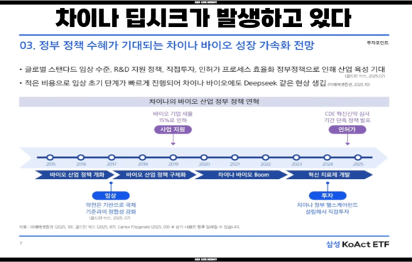게다가 중국의 바이오헬스케어 수출 비중이 35%를 차지할 정도로 이제는 큰 파이를 차지하고 있다. 양자컴퓨터, 로봇기술은 이미 미국을 뛰어넘고 인공지능까지 넘보고 있어 미국에서 생물보안법과 같은 법으로 중국이 미국을 따라오지 못하도록 경계하고 있다. 이제는 위고비, 마고자 같은 비만치료제도 개발하고 있는데, 근손실이 일어나지 않고 살을 빼주는 HANSOH의 기술이 20억불에 라이센싱을 완료했다.