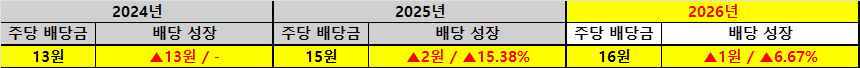 이번에 공시된 배당 정보를 살펴보면 주당 배당금은 16원으로 책정되었습니다. 지난 2024년 13원이었던 배당금이 2025년 15원을 거쳐 올해 16원까지 꾸준히 늘어나고 있는 모습을 확인할 수 있는데요. 이는 단순히 숫자가 커진 것을 넘어 기업들의 이익 성장과 주주 환원 정책이 지속되고 있다는 긍정적인 신호로 해석됩니다. 특히 배당 성장률을 보면 작년 대비 6.67% 상승했는데 비록 폭발적인 수치는 아니지만 안정적인 현금 흐름을 만들어가는 데에는 부족함이 없어 보입니다. 주가 역시 2024년 1만 2천 원대에서 시작해 현재 1만 6천 원대까지 올라서며 계좌의 자산 가치를 든든하게 받쳐주고 있습니다. 우리가 미국 지수에 투자하는 가장 큰 이유는 바로 이러한 ‘주가 상승’과 ‘배당 성장’이라는 두 마리 토끼를 동시에 잡기 위함이 아닐까 싶네요.