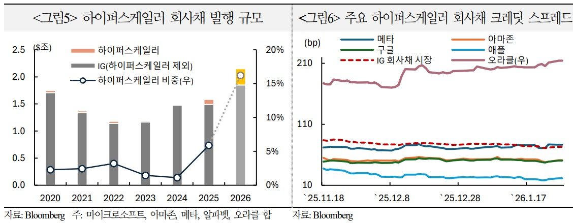 * 마이크로소프트, 아마존, 메타, 알파벳 – 이 경우 전체 투자등급 회사채 발행액 중에서 하이퍼스케일러가 차지하는 비중은 `25년 5.9% → `26년 7.6%~16%으로 확대