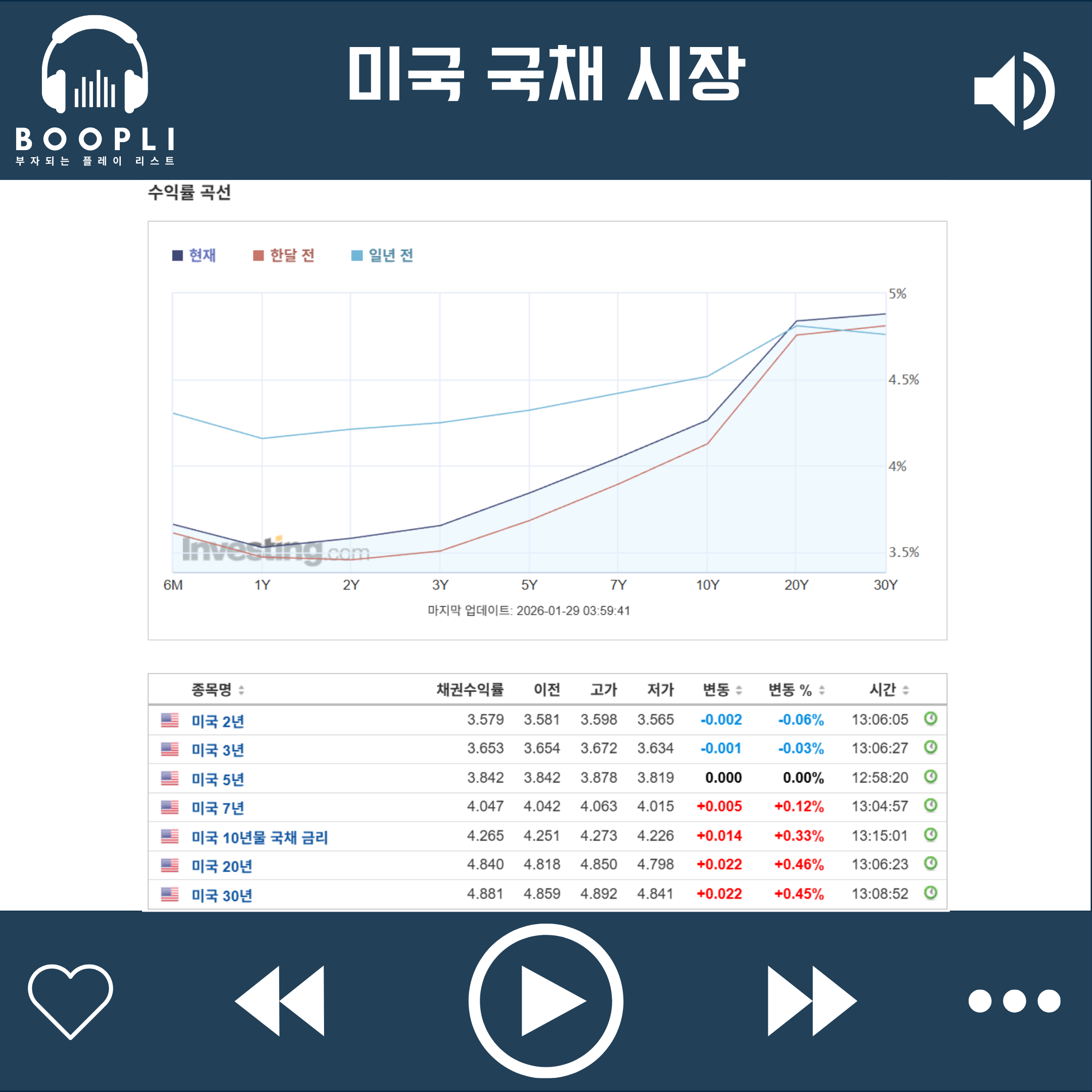 미국 국채는 1월 FOMC에서 연준이 기준금리를 예상대로 3.50~3.75%로 동결하고, 성명문에서 경제 성장 평가를 ‘완만한(moderate)’에서 ‘견조한(solid)’으로 상향 조정하자 장단기 금리 모두 상승