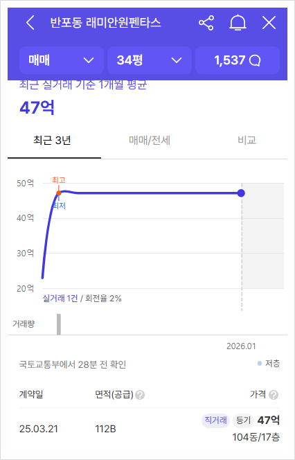 재건축한 래미안 원펜타스는 24년 6월 평당가 6,766만원으로 적용되어 역대 최대 분양가 기록을 달성했다. 현재는 34평이 50억 수준이라 분양가보다 30억 가까이 올라 당첨된 사람은 진짜 로또보다 더한 복권에 당첨된 것이다. 24년 분양을 시작할 때 래미안 원펜타스는 1순위에만 9만명이 몰렸고 평균 경쟁률이 무려 527 : 1이였다.