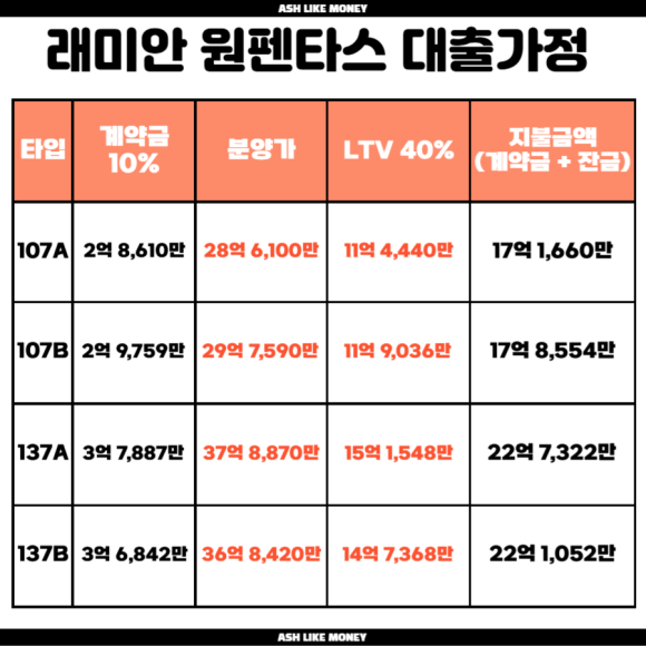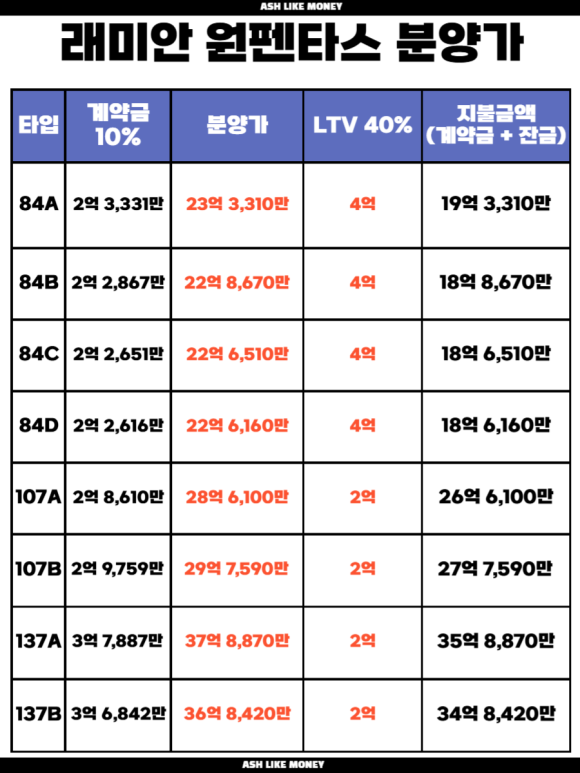 래미안 원펜타스의 분양가는 평당 6,736만이다. 59타입은 17억 4,610만원이며 84타입은 23억 3,310만원, 107타입은 29억 7,590만원이다. 이혜훈 장관후보자가 당첨된 아파트는 137타입으로 분양가는 36억 7,840만원이고 계약금은 3억 6,784만원이다.