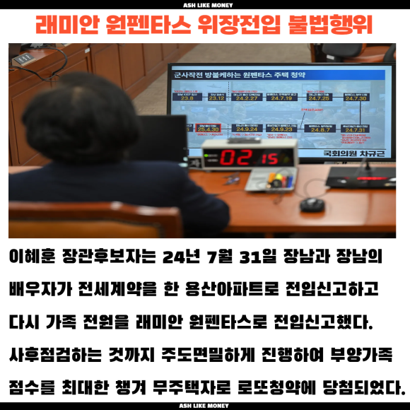 이혜훈 장관후보자가 낙마하게 된 원인 중 하나가 래미안 원펜타스 당첨에 불법행위를 했다는 의혹 때문이다. 래미안 원펜타스에 당첨되기 위해 23년 12월 결혼한 장남을 부양가족으로 올려 청약가점을 높게 받았다. 결혼을 하였음에도 불구하고 혼인신고를 하지 않고 부모와 주소를 같이하여 부양가족 가점을 올린 전형적인 위장미혼이라는 점에서 많은 질타를 받았다.
