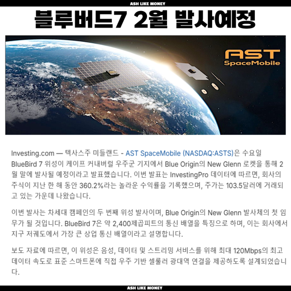 우주 관련 산업이 정말로 핫해졌다. 아예 버블이 아닐까 싶을 정도로 많이 올랐는데, 이는 스페이스X의 상장과 함께 관련주들이 기대감으로 오른 것이다. AI버블보다 오히려 우주 산업 버블이 더 심하게 낀 느낌이지만, 아직 우주 산업에 대한 언급은 없다. 특히, 2년 만에 4,000%나 상승한 어마무시한 주식이 있는데 그 이름은 AST 스페이스모바일로 최근에는 블루버드 위성이 성공적인 궤도 진입으로 투자자들의 이목을 끌었다.