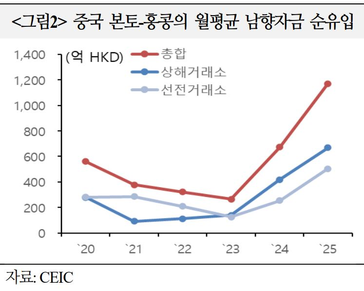 – 중국의 투자자금이 홍콩으로 순유입되는 남향자금(Southbound)이 `24년 월평균 673억 홍콩달러에서 `25년 1,171억 홍콩달러로 74% 증가하며 시장 유동성을 확대