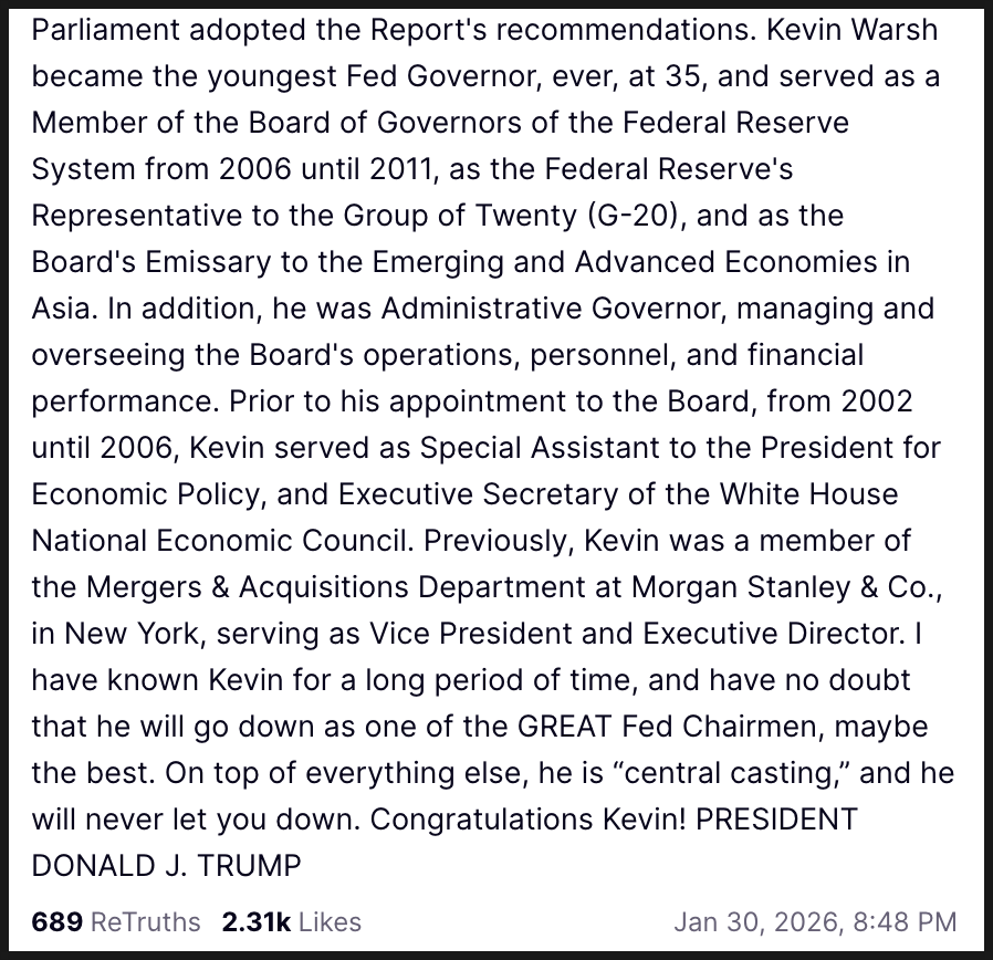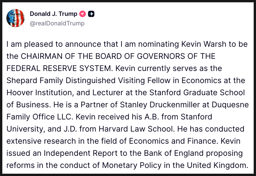 도널드 트럼프 대통령이 케빈 워시를 연방준비제도 이사회 의장으로 지명한다고 직접 발표했습니다. 본인의 이름을 걸고 낸 성명인 만큼, 더 이상 후보 단계가 아니라 트럼프의 선택이 확정됐다는 의미로 받아들여야 할 것 같습니다.