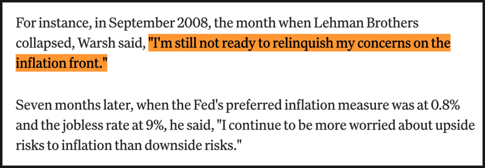 리먼브러더스가 파산한 2008년 9월에도 워시는 “인플레이션에 대한 우려를 아직 내려놓을 준비가 되지 않았다”고 말했고, 이후 연준이 선호하는 물가지표가 0.8%에 불과하고 실업률이 9%에 달했을 때조차 “인플레이션이 위쪽으로 튈 위험이 더 걱정된다”고 언급했습니다.