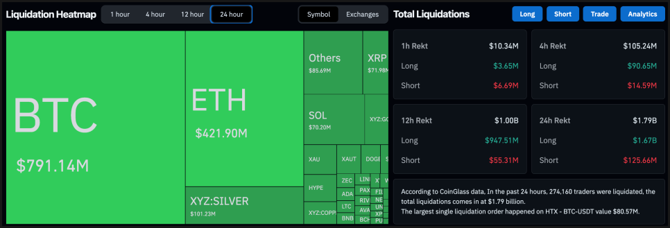 코인 시장에서는 이 충격이 레버리지 포지션을 정면으로 때렸습니다. 가격이 빠르게 밀리면서 파생상품 시장에서 강제 청산이 연쇄적으로 발생했고, 그 규모가 하루 만에 약 18억 달러에 달했습니다. 연초부터 크립토 시장 흐름이 좋지 않았음에도 불구하고, 많은 레버리지 투자자들이 이 정도 급락을 예상하지 못한 셈이죠.