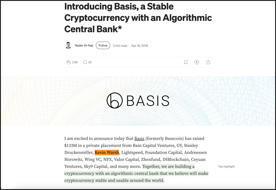 워시는 과거 ‘베이시스’라는 암호화폐 프로젝트의 투자자였습니다. 이 프로젝트는 스스로를 ‘알고리즘 중앙은행’이라고 설명했는데요, 쉽게 말해 중앙은행이 금리를 조절하듯, 코드와 알고리즘으로 코인 공급량을 자동 조절해 가격을 안정시키겠다는 구상이었습니다. 지금 기준으로 보면 다소 실험적이고 이상적인 발상이었고, 알고리즘 스테이블코인 모델이 가진 한계도 이후 여러 사례를 통해 드러났죠.