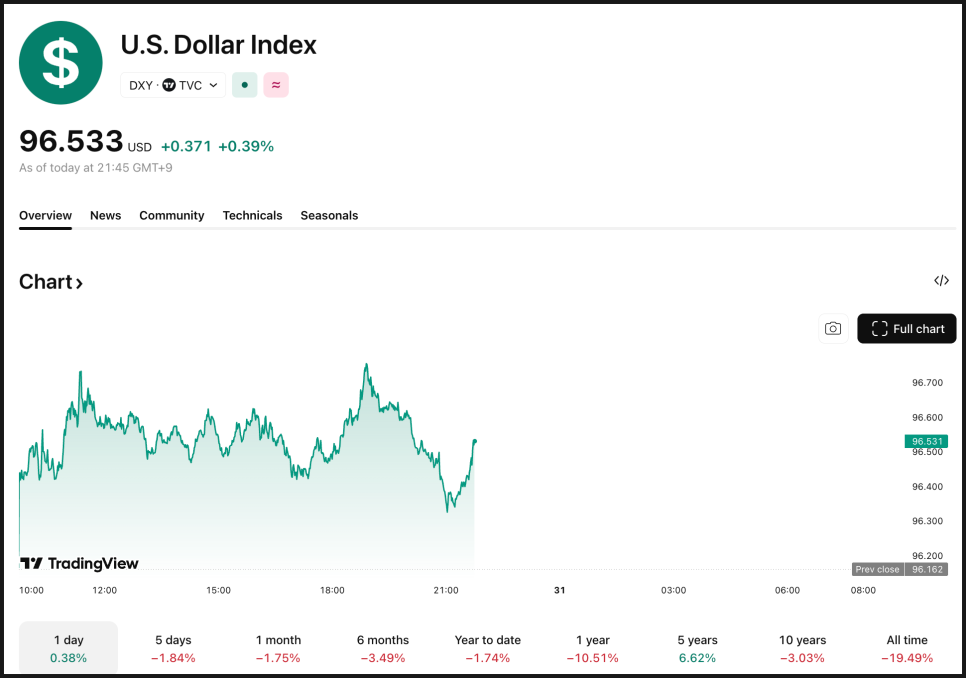 미국 주식 지수 선물은 소폭 하락한 반면, 달러 인덱스는 0.57% 상승했습니다. 시장에서는 케빈 워시가 차기 연준 의장으로 유력하다는 관측이 달러를 밀어 올리고 있다는 해석이 나왔는데요. 통화 정책이 더 긴축적으로 갈 수 있다는 기대만으로도 달러에는 힘이 실리는 상황입니다.