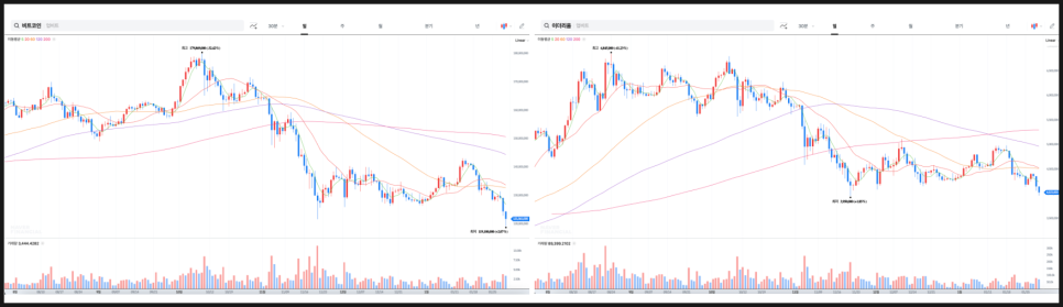 비트코인은 지난 11월 말에 찍었던 저점을 뚫고 내려간 상황이고 이더리움은 간신히 버텨주고 있습니다. 현재로선 신저점을 계속 갱신해 나갈 것인지 지켜보도록 하겠습니다.