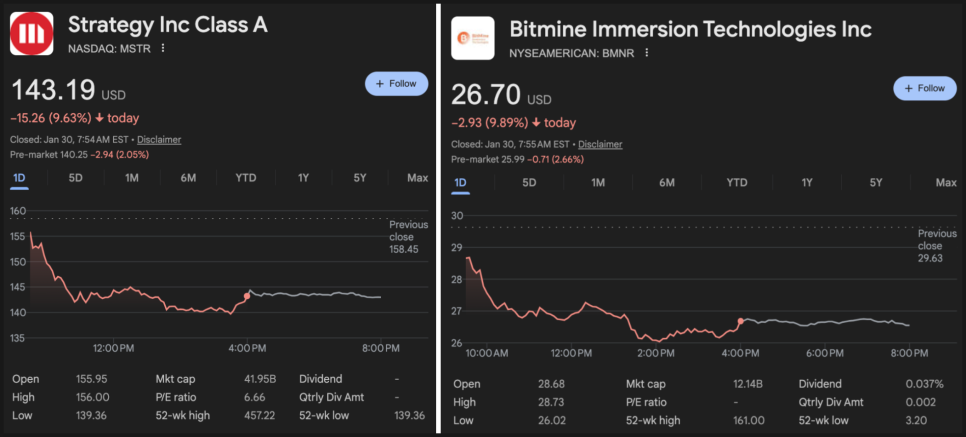 프리마켓에서 스트래티지와 비트마인 주가는 각각 2%에서 3% 하락 중입니다.