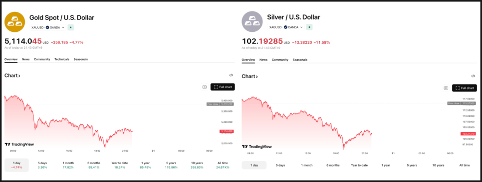 그런데 이번 하락은 코인 시장만의 문제가 아니었습니다. 은과 금 같은 귀금속도 동시에 크게 흔들렸습니다. 은은 목요일에 기록했던 온스당 121달러 고점 대비 약 20% 급락해 현재는 96달러 선까지 내려왔고, 금 역시 수요일 5,600달러 고점에서 11% 이상 밀리며 다시 5,000달러 아래로 내려왔습니다.