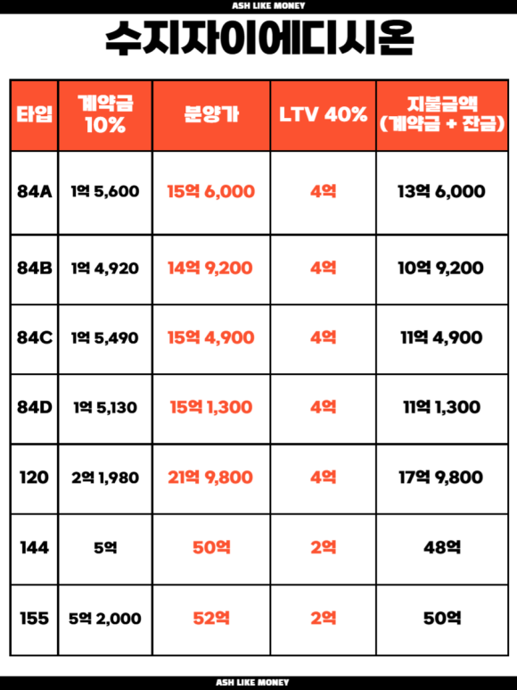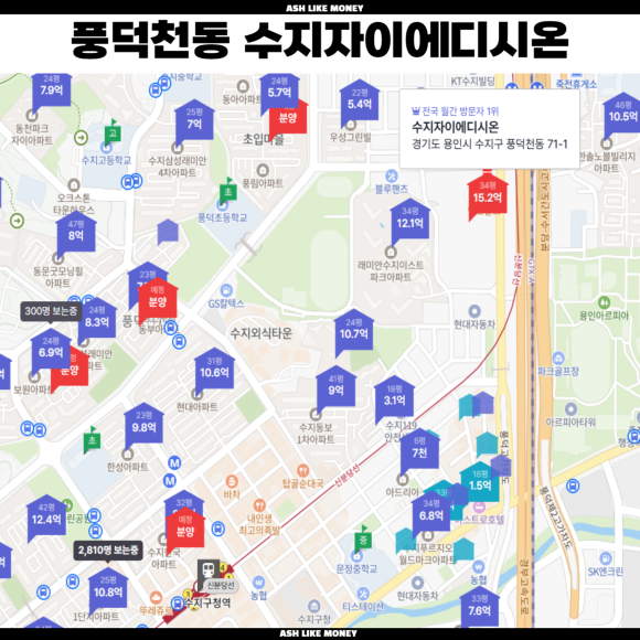 주 연속 전국에서 가장 높은 집값 상승률을 보인 곳이 수지이다. 그래서 이번 무순위청약에 몰릴 사람들이 많을 것이라 본다. 분양가는 84타입이 15억 이상이라 평당 4,500만원 이상이다.