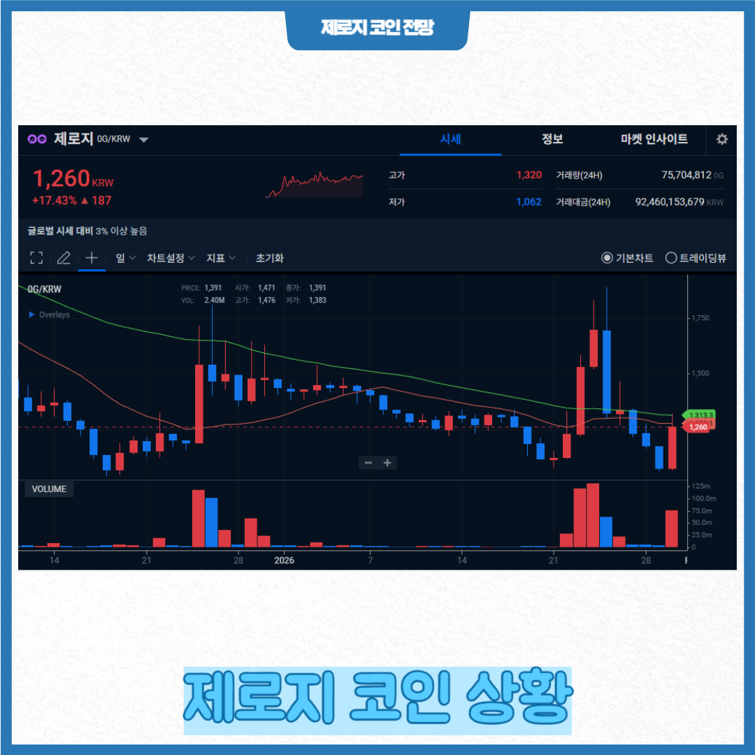 2026년 1월 말 기준으로 시장 정보 플랫폼 기준 제로지 가격은 약 1,000원대 초중반 수준을 기록하고 있으며 최근 변동성은 상대적으로 높은 편입니다. 시가총액도 전체 암호화폐 시장에서 상위권에 속하지만 변동폭이 크다는 점이 특징입니다.