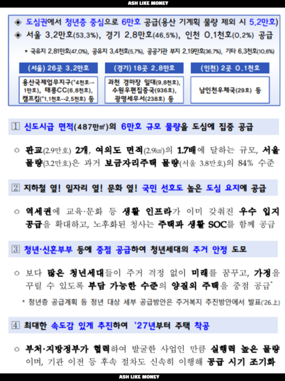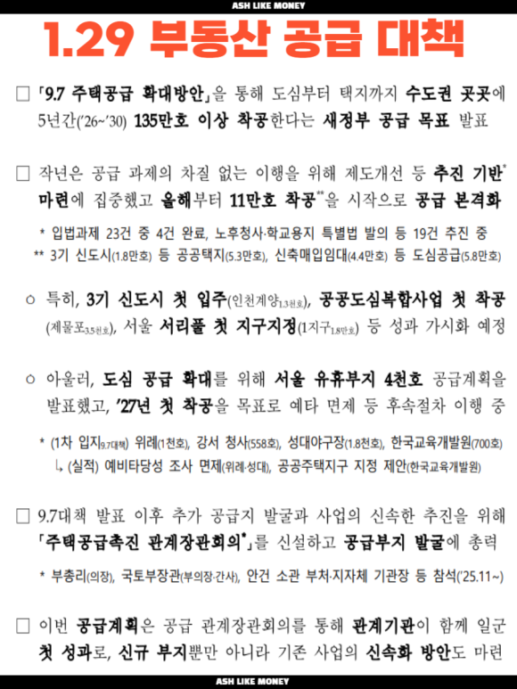 26년 1월 29일 공급대책이 나왔다. 정부는 수도권 도심 내 공공부지에 청년과 신혼부부를 대상으로 하는 6만호 공급방안이다. 이는 9.7대책의 공급계획을 구체화한 방안으로 과거 9.7대책 방안이 확실한 공급이 없다는 시그널을 주었기에 사람들은 너도나도 없이 부동산 매수를 시작했다.