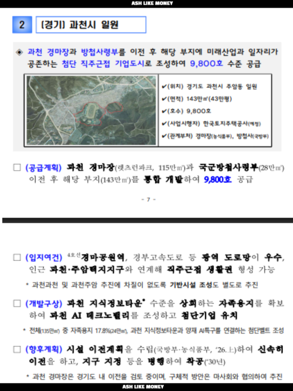 경마공원역, 경부고속도로 등 광역 도로망이 우수, 인근 과천-주암택지지구와 연계하여 직주근접 생활권을 형성하려고 한다. 과천 지식정보타운 수준을 상회하는 자족용지를 확보하여 AI 테크노밸리를 조성하고 첨단기업을 유치하려고 추진 중이다. 과천 경마장을 신속히 이전시키고 지구지정 등을 고려하여 30년 착공을 목표로 한다.