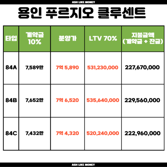 용인 푸르지오 클루센트는 처인구 신대지구 A-1블럭에 위치하며 역북동 811번지 일대이다. 총 784세대이며 타입은 84A, B, C타입이다. 용인 푸르지오 클루센트의 규모는 지하 3층~지상 29층의 6개 단지로 이루어진다. 전용 84타입은 남향 위주의 4베이 판상형 맞통풍 구조이며 현관과 주방에 팬트리가 마련되었다. 이번에 무순위청약으로 나오는 세대수가 120세대로 상당히 많이 미분양이 되어 풀리는 세대수가 많다.