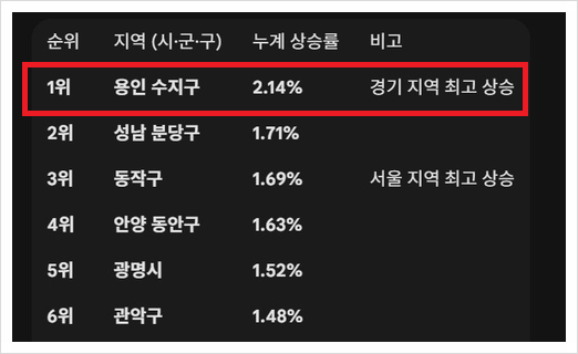공단과는 15분 거리에만 있다면 공장에 의한 영향을 크게 받지는 않는 편이기에 향후 반도체 공장이 가동한다면 엄청난 시너지를 작용할 것이라 보인다. 그래서 용인이 지금 가장 집값 상승이 높으며 수지구가 전국 최고로 상승하고 있는 모습을 보이고 있는 것이다.