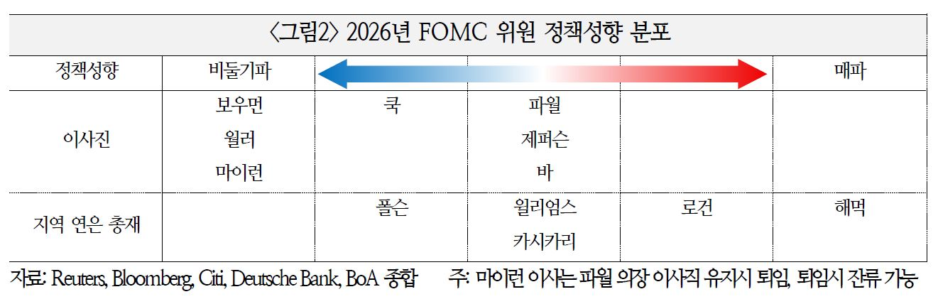 26년 FOMC 투표위원(이시잔 7명, 지역 연은 총재 5명 총 12명)의 정책 성향은 파월 의장의 이사직 사임 시 전년대비 비둘기파적 성향이 다소 강화될 가능성